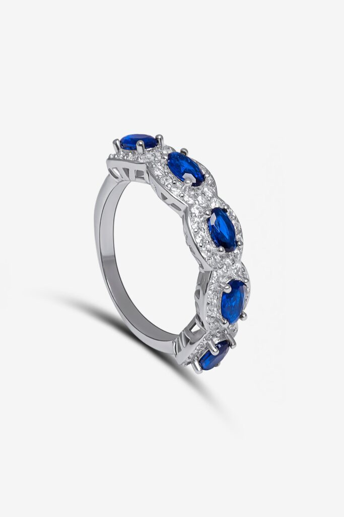 Kjo unazë mahnitëse është punuar me argjend të pastër 925, duke rrezatuar elegancë të përjetshme dhe cilësi të lartë. Dizajni i saj i mrekullueshëm përmban një seri gurësh zirconia të kaltër të ndritshëm, secili i vendosur në një formë delikate ovale, të rrethuar nga gurë zirconia të bardhë shkëlqyes.