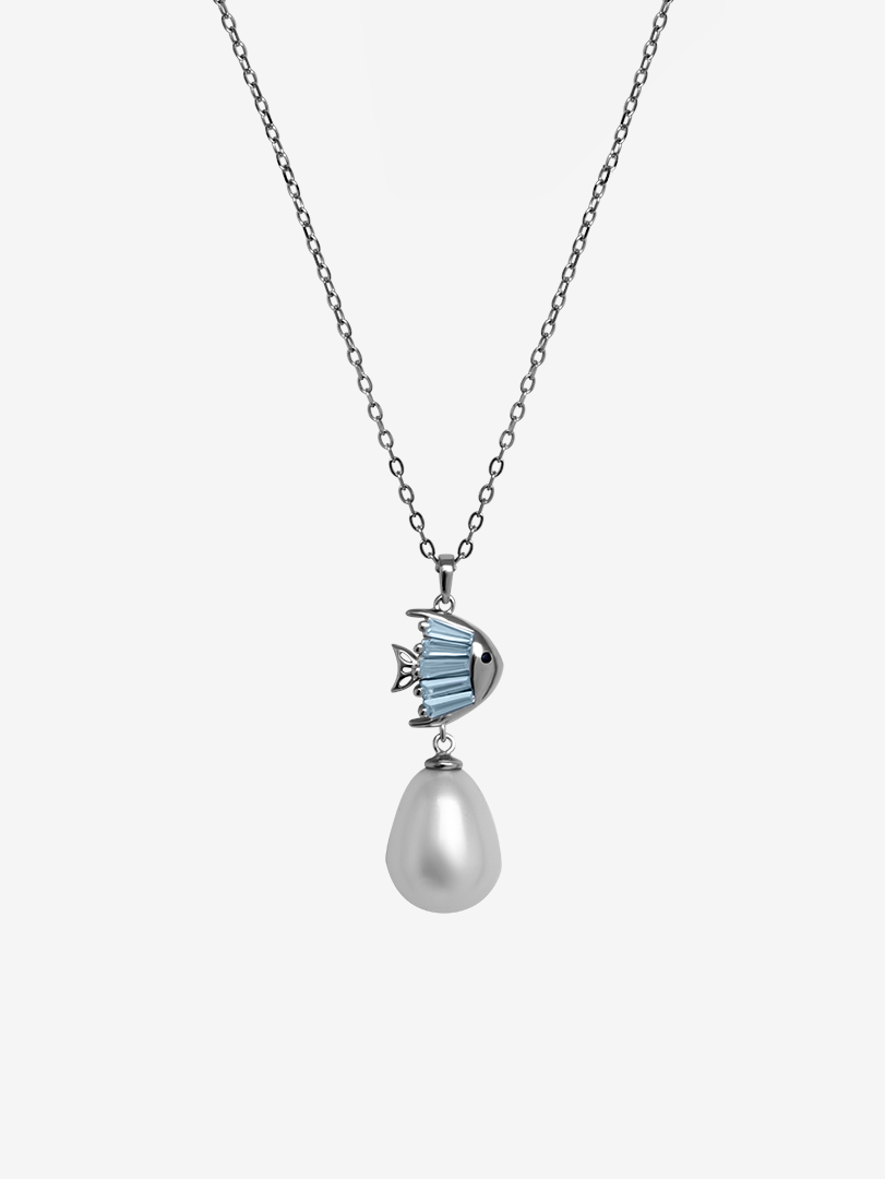 This beautiful styled necklace is a unique design and stands out with a beautiful drop pearl at the bottom and a cute little fish at the top holding the pearl, the fish charm features baguette cut white zirconia gems for that extra attention to detail. This beautiful necklace can be worn on its own or layered with other pieces of jewelry.